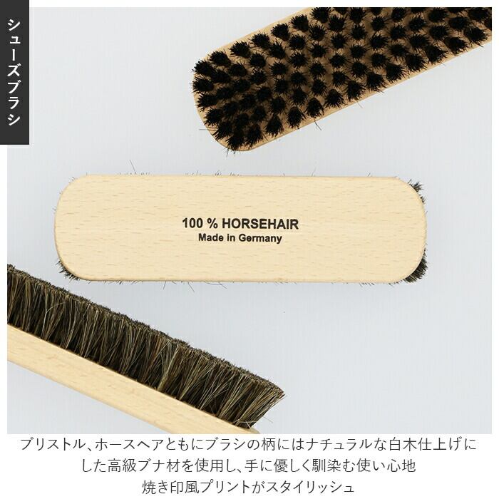 ・ドイツブラシ ホースヘアは高級馬毛を100%使用。毛質が柔らかくホコリ落としやクリームの塗り込みなど様々な用途に使用可能。