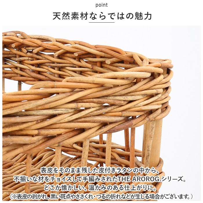 ・表皮をそのまま残した皮付きラタンの中から、不揃いな材をチョイスして手編みされたTHE AROROG.シリーズ。どこか懐かしい、温かみのある仕上がりに。(※表皮の剥がれ、黒い斑点やささくれ・つるの折れなどが生じる場合がございます。)