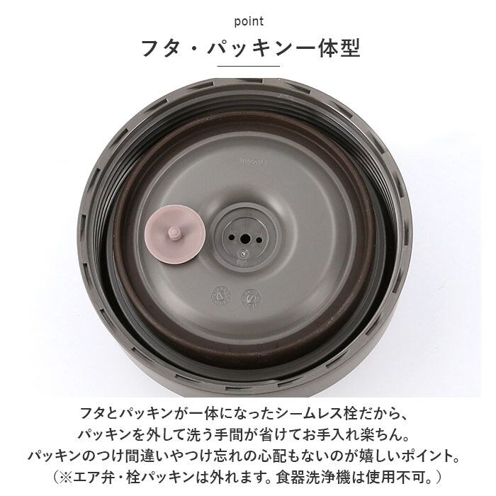 ・フタとパッキンが一体になったシームレス栓だから、パッキンを外して洗う手間が省けてお手入れ楽ちん。パッキンのつけ間違いやつけ忘れの心配もないのが嬉しいポイント。(※エア弁・栓パッキンは外れます。食器洗浄機はご使用いただけません。)