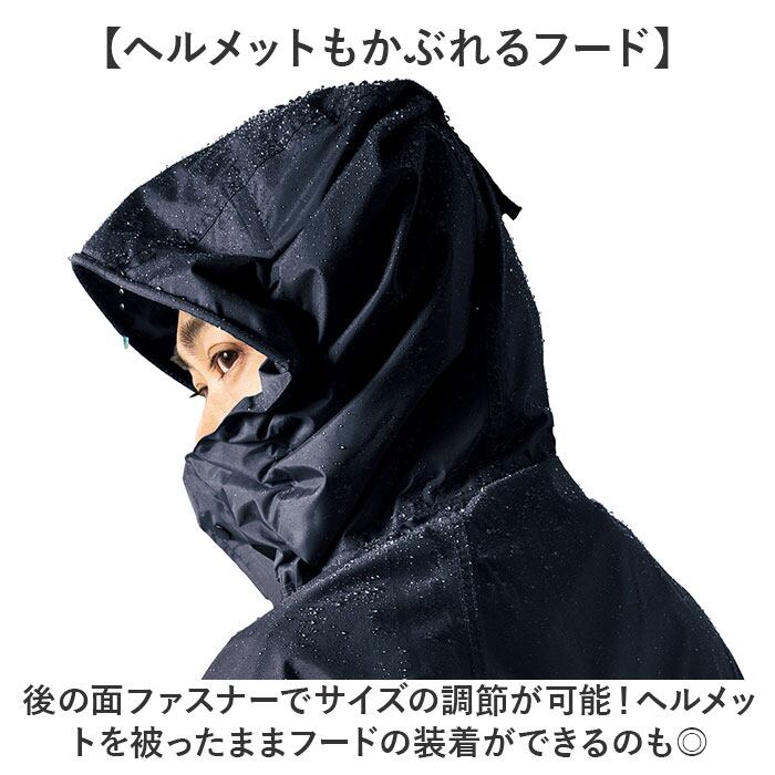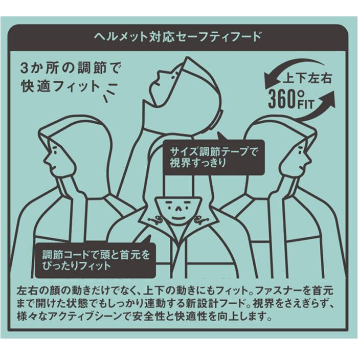 ・後の面ファスナーでサイズの調節が可能!ヘルメットを被ったままフードの装着ができるのも◎