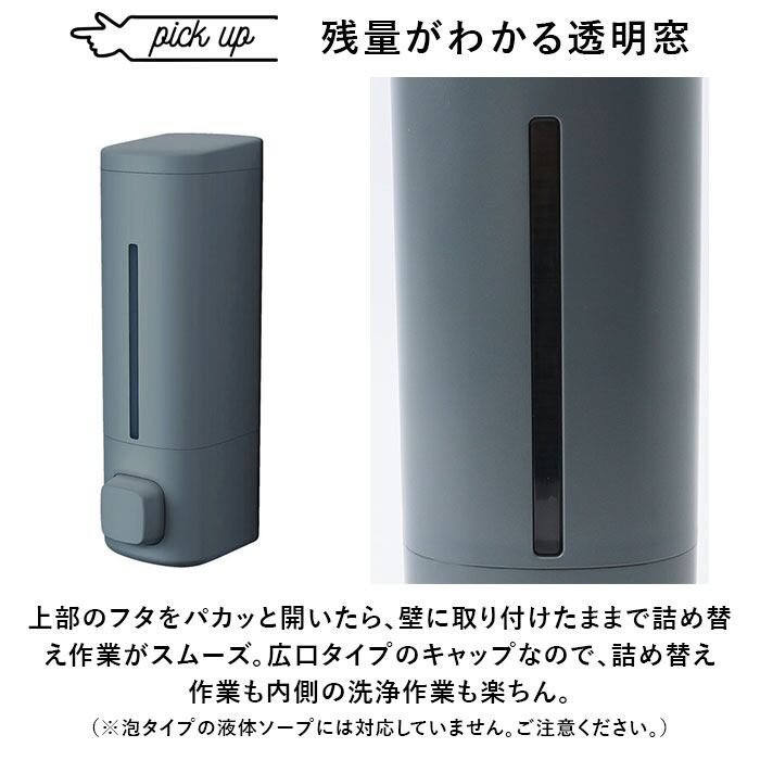 ・正面に透明窓が付いているので、ソープの残量もひと目で確認。ソープが下から出るタイプだから、液残りが少なく、最後まで使い切れるのも嬉しいポイント。