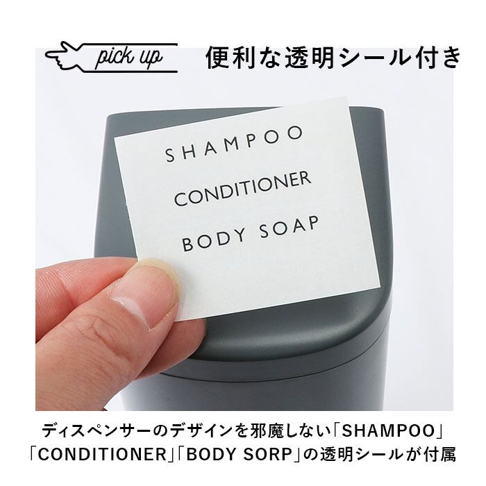 ・ディスペンサーのデザインを邪魔しない「SHAMPOO」「CONDITIONER」「BODY SORP」の透明シールが付属。