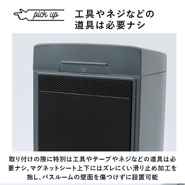 ・本体背面の強力マグネットシートでユニットバスの壁面に簡単吸着!容器を宙に浮かせて収納できるから、もう底面のぬめり汚れも気にならない!(※マグネットが吸着する一般的なシステムバスの壁パネルで使用できます。)