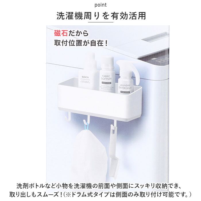・洗剤ボトルなど小物を洗濯機の前面や側面にスッキリ収納でき、取り出しもスムーズ!(※ドラム式タイプは側面のみ取り付け可能です。)