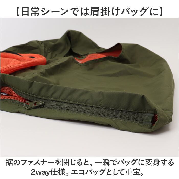 ・裾のファスナーを閉じると、一瞬でバッグに変身する2way仕様。エコバッグとして重宝。