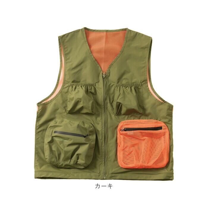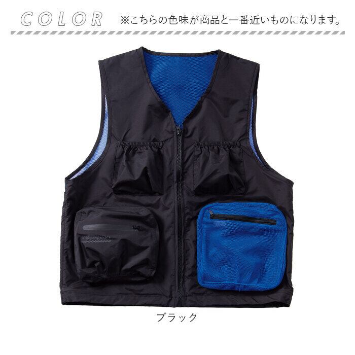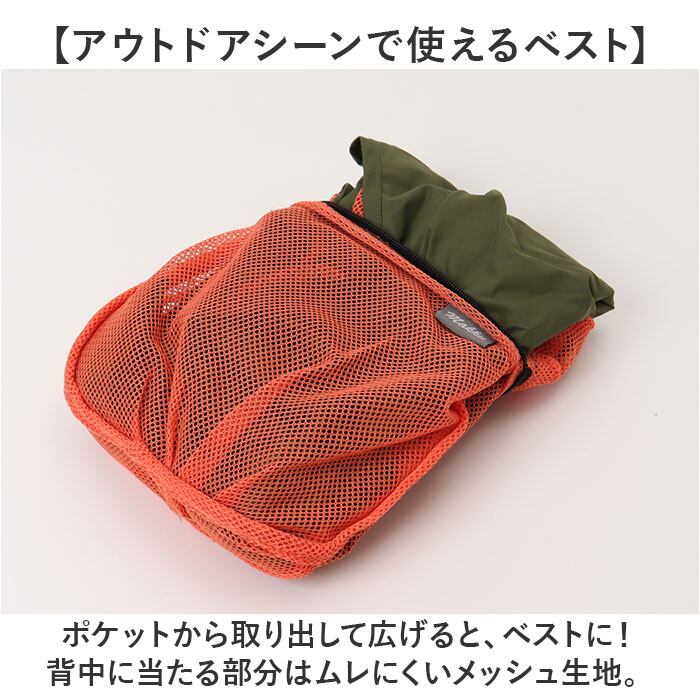 ・ポケットから取り出して広げると、ベストに!背中に当たる部分はムレにくいメッシュ生地。