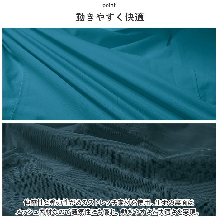 ・伸縮性と弾力性があるストレッチ素材を使用。生地の裏面はメッシュ素材なので通気性にも優れ、動きやすさと快適さを実現。