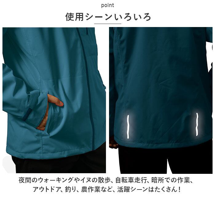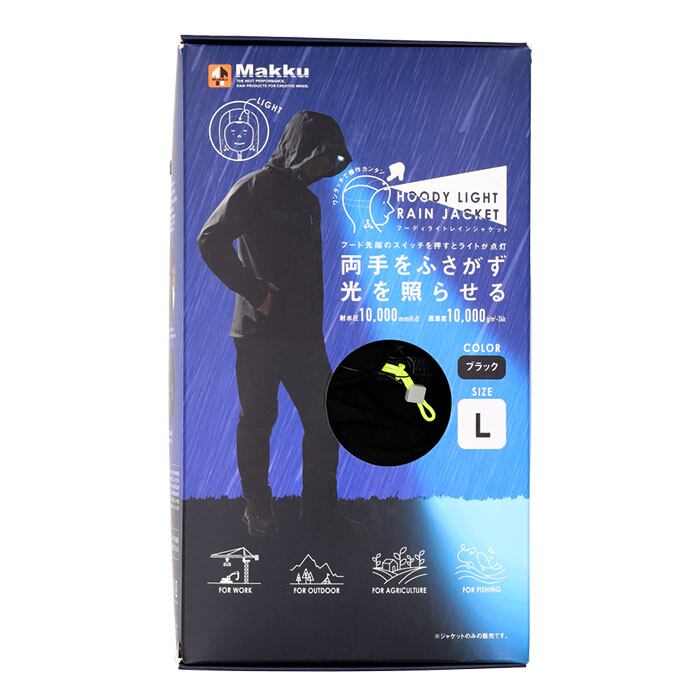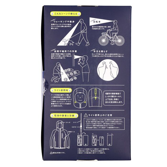 ・フード先端にライトが搭載されており、暗闇でも手元をしっかりと照らす優れたアイテム。両手がフリーで使えるので作業に最適◎