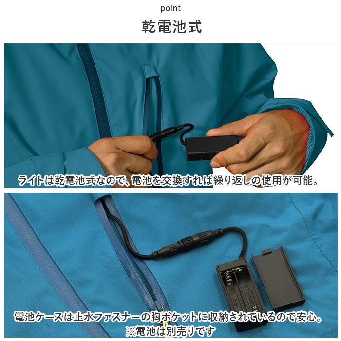 ・ライトは乾電池式なので、電池を交換すれば繰り返しの使用が可能。電池ケースは止水ファスナーの胸ポケットに収納されているので安心。