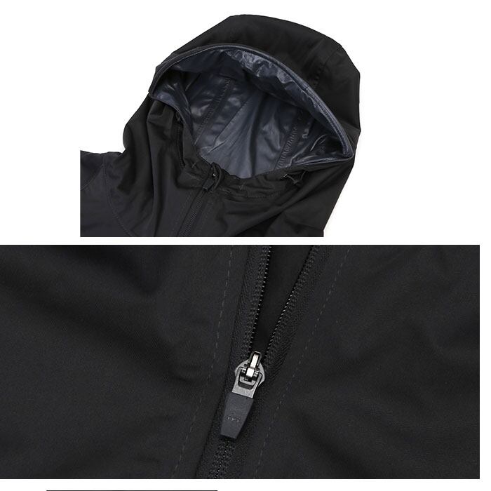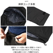 ・裾部分、フード部分、ウエスト部分、袖口、裾部分に調節コードあり!雨や水が入り込むのをガードしてくれる。