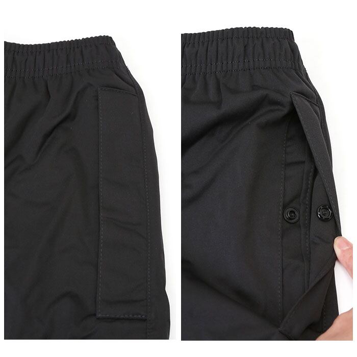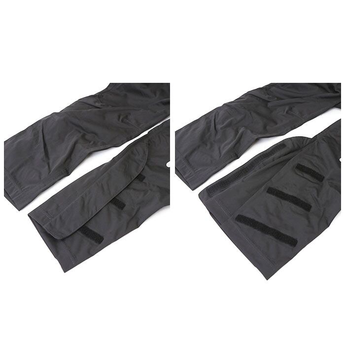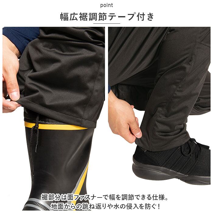 ・裾部分は面ファスナーで幅を調節できる仕様。地面からの跳ね返りや水の侵入を防ぐ!