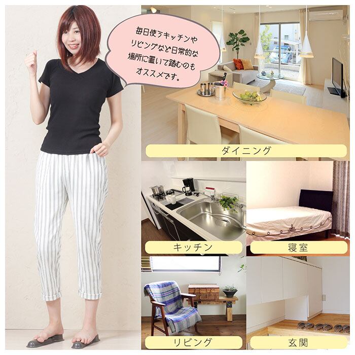 ・使い方はカンタン。楕円形のフラット部分に踵をのせ、かまぼこ状の部分に足先をのせて立ち、膝を曲げて足先に体重をのせるだけ!