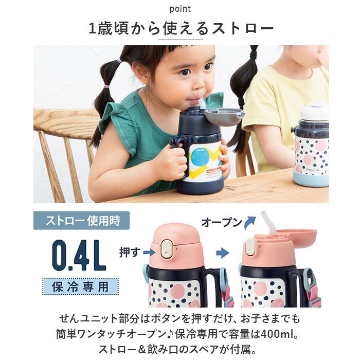 ・せんユニット部分はボタンを押すだけ、お子さまでも簡単ワンタッチオープン♪保冷専用で容量は400ml。ストロー&飲み口のスペアが付属。