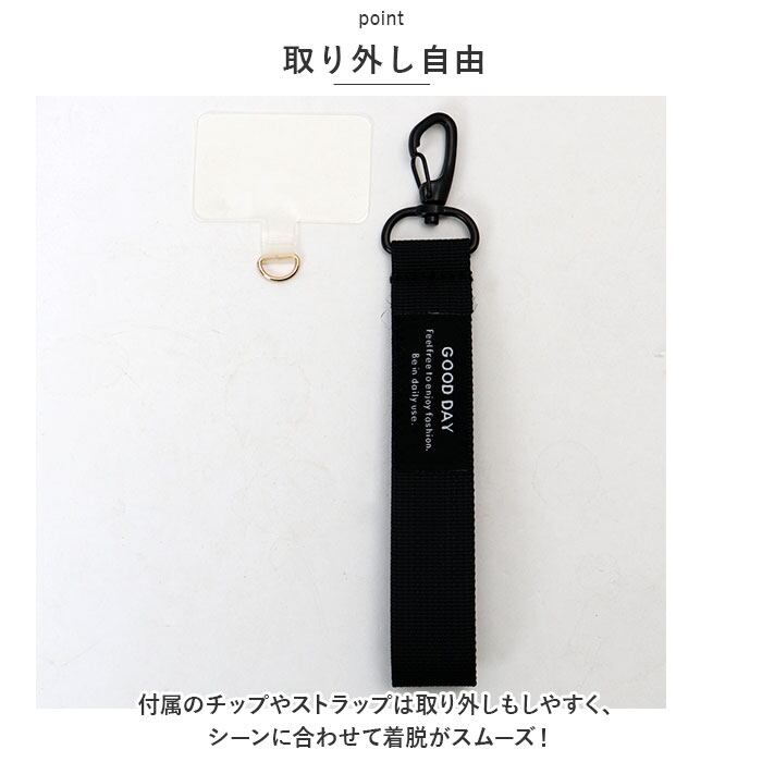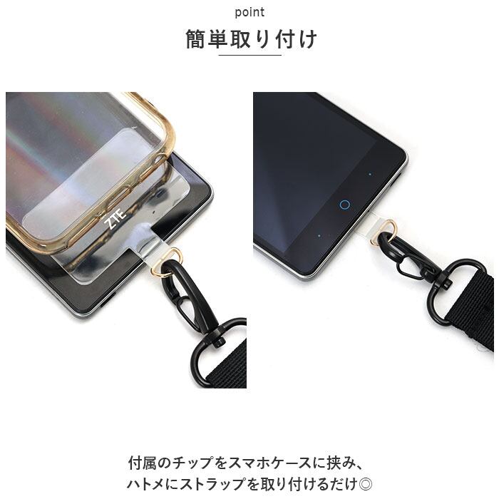 ・付属のチップをスマホケースに挟み、ハトメにストラップを取り付けるだけ◎