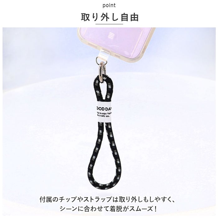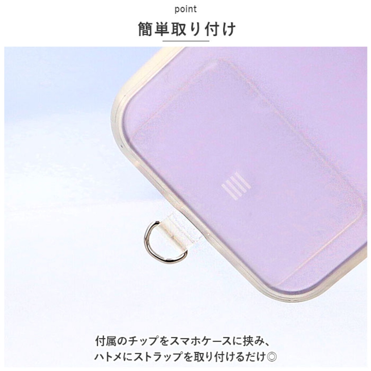 ・付属のチップをスマホケースに挟み、ハトメにストラップを取り付けるだけ◎
