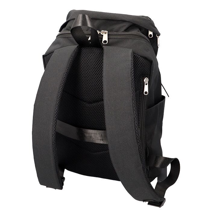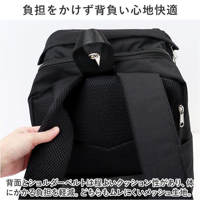 ・背面とショルダーベルトは程よいクッション性があり、体にかかる負担を軽減。どちらもムレにくいメッシュ生地。