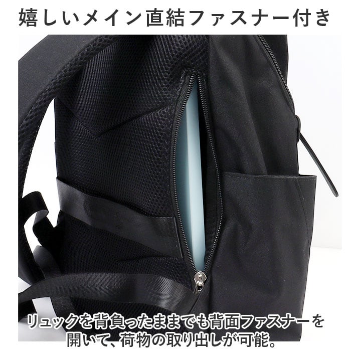・リュックを背負ったままでも背面ファスナーを開いて、荷物の取り出しが可能。