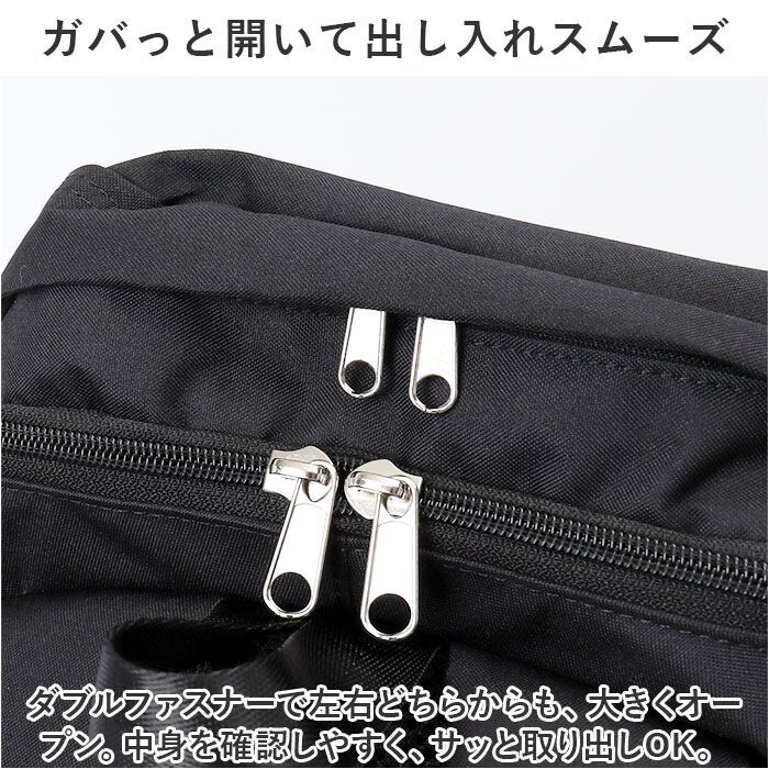 ・ダブルファスナーで左右どちらからも、大きくオープン。中身を確認しやすく、サッと取り出しOK。