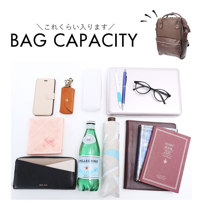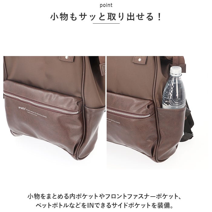 ・小物をまとめる内ポケットやフロントファスナーポケット、ペットボトルなどをINできるサイドポケットを装備。
