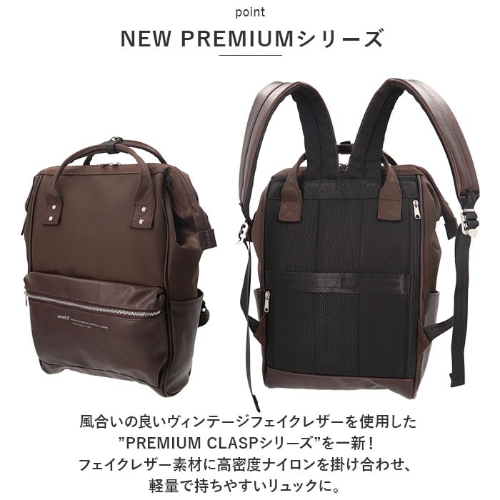 ・風合いの良いヴィンテージフェイクレザーを使用した”PREMIUM CLASPシリーズ”を一新!フェイクレザー素材に高密度ナイロンを掛け合わせ、軽量で持ちやすいリュックに。