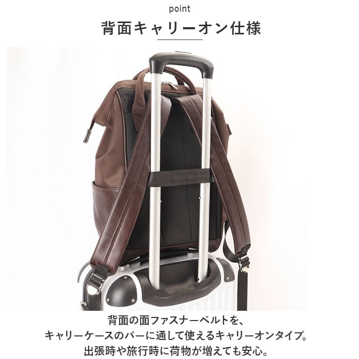 ・背面の面ファスナーベルトを、キャリーケースのバーに通して使えるキャリーオンタイプ。出張時や旅行時に荷物が増えても安心。
