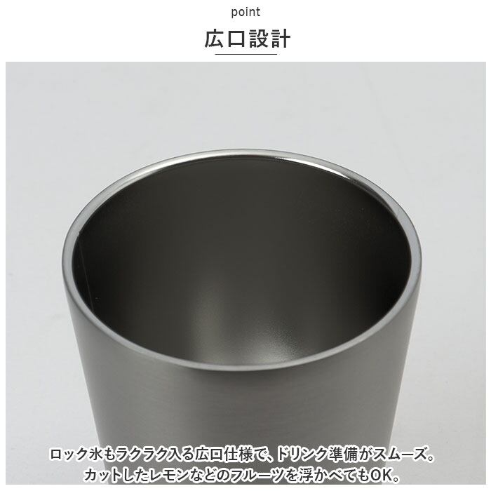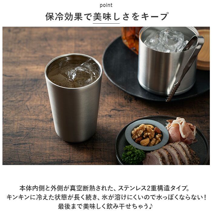 ・本体内側と外側が真空断熱された、ステンレス2重構造タイプ。キンキンに冷えた状態が長く続き、氷が溶けにくいので水っぽくならない!最後まで美味しく飲み干せちゃう♪