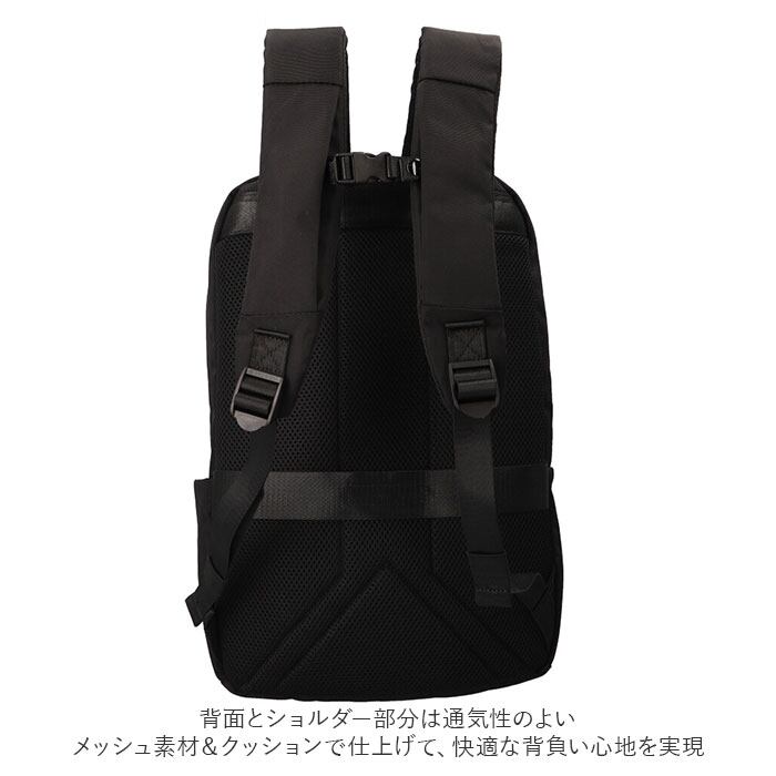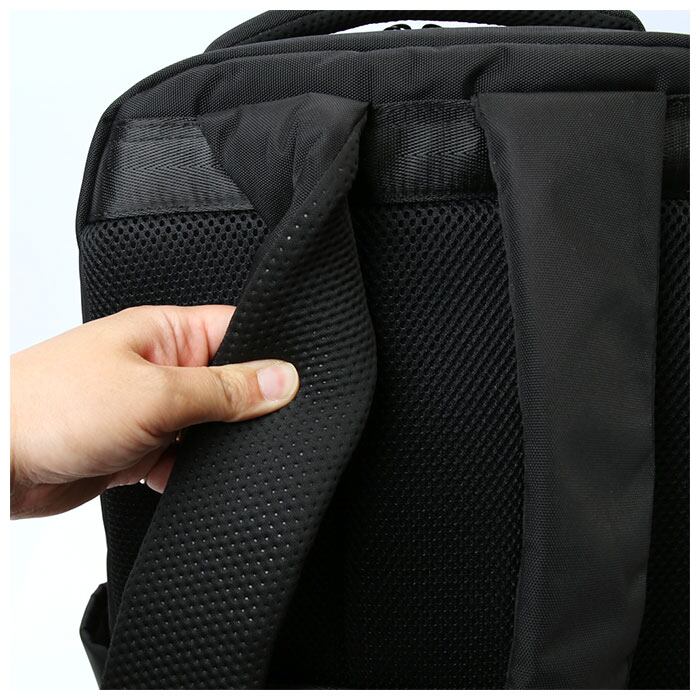 ・背面とショルダー部分は通気性のよいメッシュ素材&クッションで仕上げて、快適な背負い心地を実現。