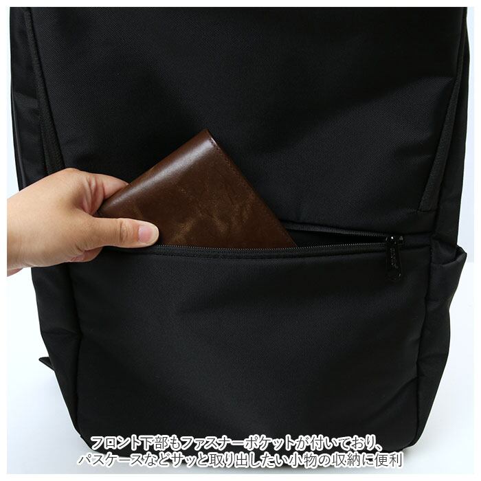 ・フロント上部のファスナーポケットの中にオープンポケット×2、ペン挿し×3、フロント下部もファスナーポケットが付いており、パスケースなどサッと取り出したい小物の収納に便利。