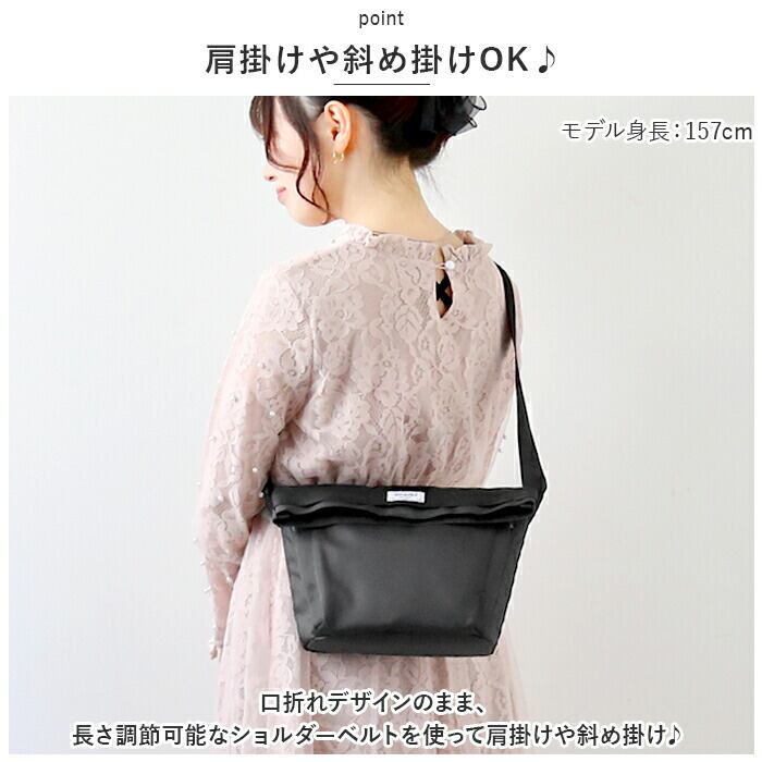 ・口折れデザインのまま、長さ調節可能なショルダーベルトを使って肩掛けや斜め掛け♪口を伸ばせば手持ちのトートバッグに変身!