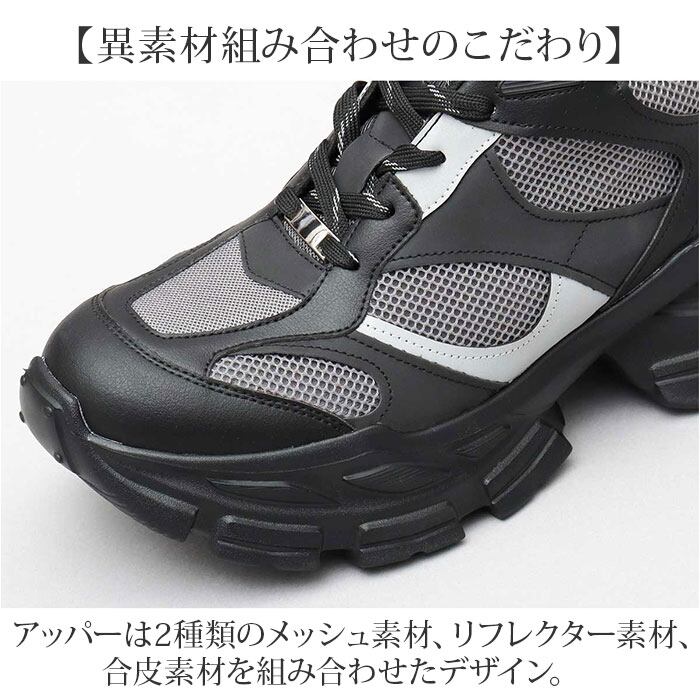 ・アッパーは2種類のメッシュ素材、リフレクター素材、合皮素材を組み合わせたデザイン。
