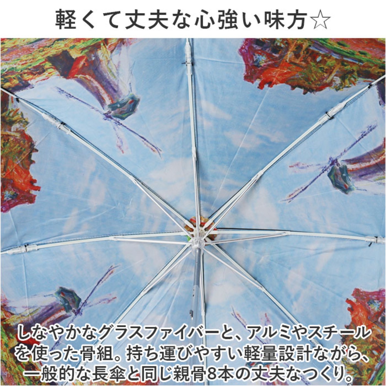 ・世界的に有名な名画を、傘生地の内側全面にプリント。お気に入りの作品がきっと見つかる、豊富なバリエーション。