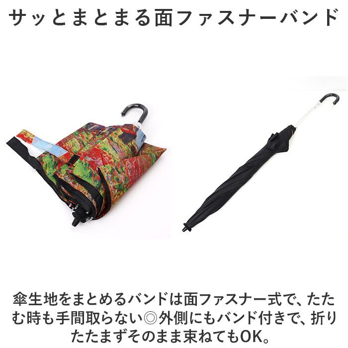 ・傘生地をまとめるバンドは面ファスナー式で、たたむ時も手間取らない◎外側にもバンド付きで、折りたたまずそのまま束ねてもOK。