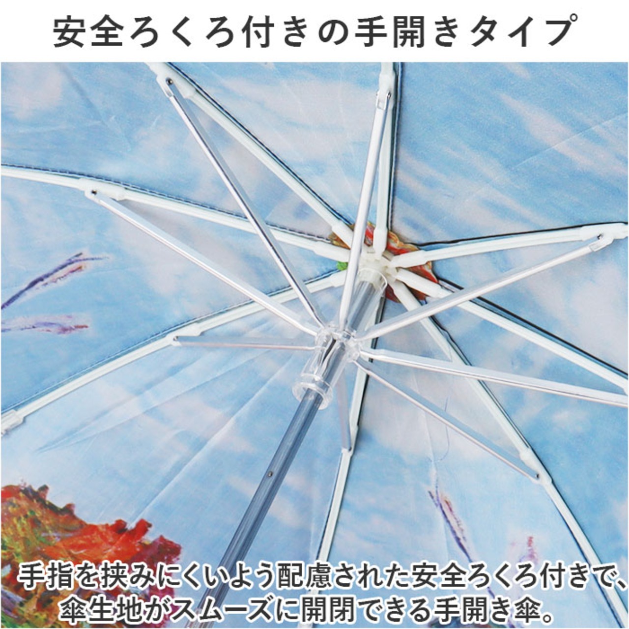 ・手指を挟みにくいよう配慮された安全ろくろ付きで、傘生地がスムーズに開閉できる手開き傘。