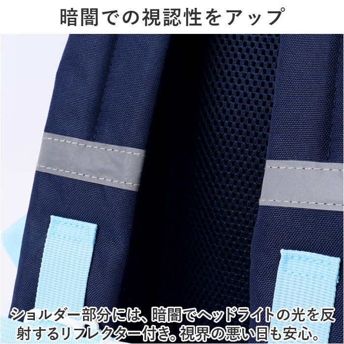 ・ショルダー部分には、暗闇でヘッドライトの光を反射するリフレクター付き。視界の悪い日も安心。