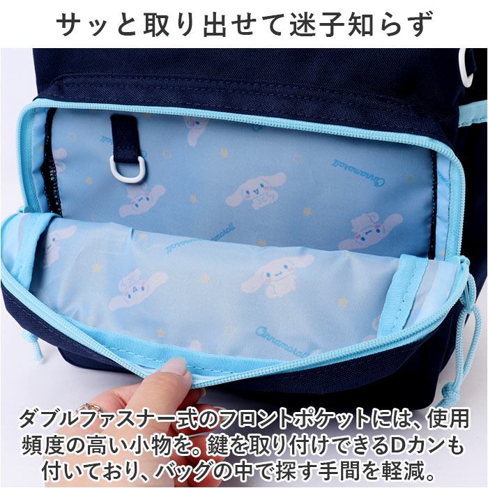 ・ダブルファスナー式のフロントポケットには、使用頻度の高い小物を。鍵を取り付けできるDカンも付いており、バッグの中で探す手間を軽減。