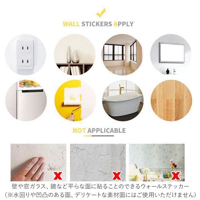 ・ご自宅の壁や窓ガラス、鏡など平らな面に貼ることのできるウォールステッカー。(※水回りや凹凸のある面、デリケートな素材面にはご使用いただけません。)