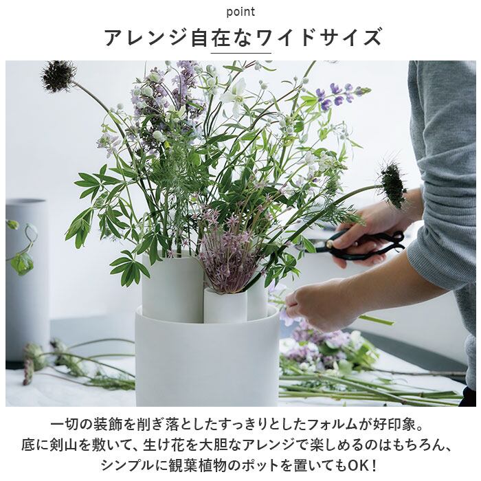 ・一切の装飾を削ぎ落としたすっきりとしたフォルムが好印象。底に剣山を敷いて、生け花を大胆なアレンジで楽しめるのはもちろん、シンプルに観葉植物のポットを置いてもOK!