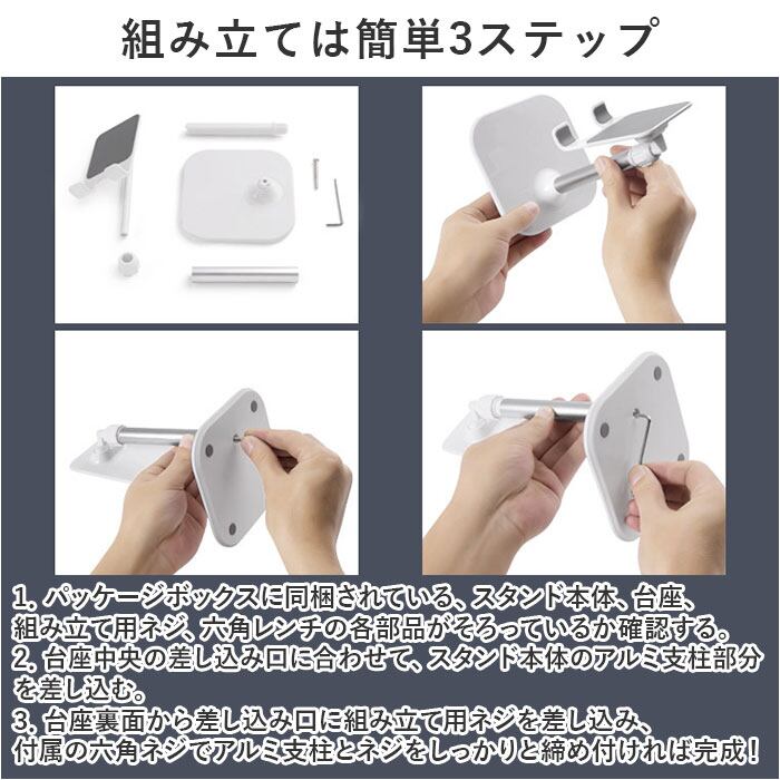 3.台座裏面から差し込み口に組み立て用ネジを差し込み、付属の六角ネジでアルミ支柱とネジをしっかりと締め付ければ完成!