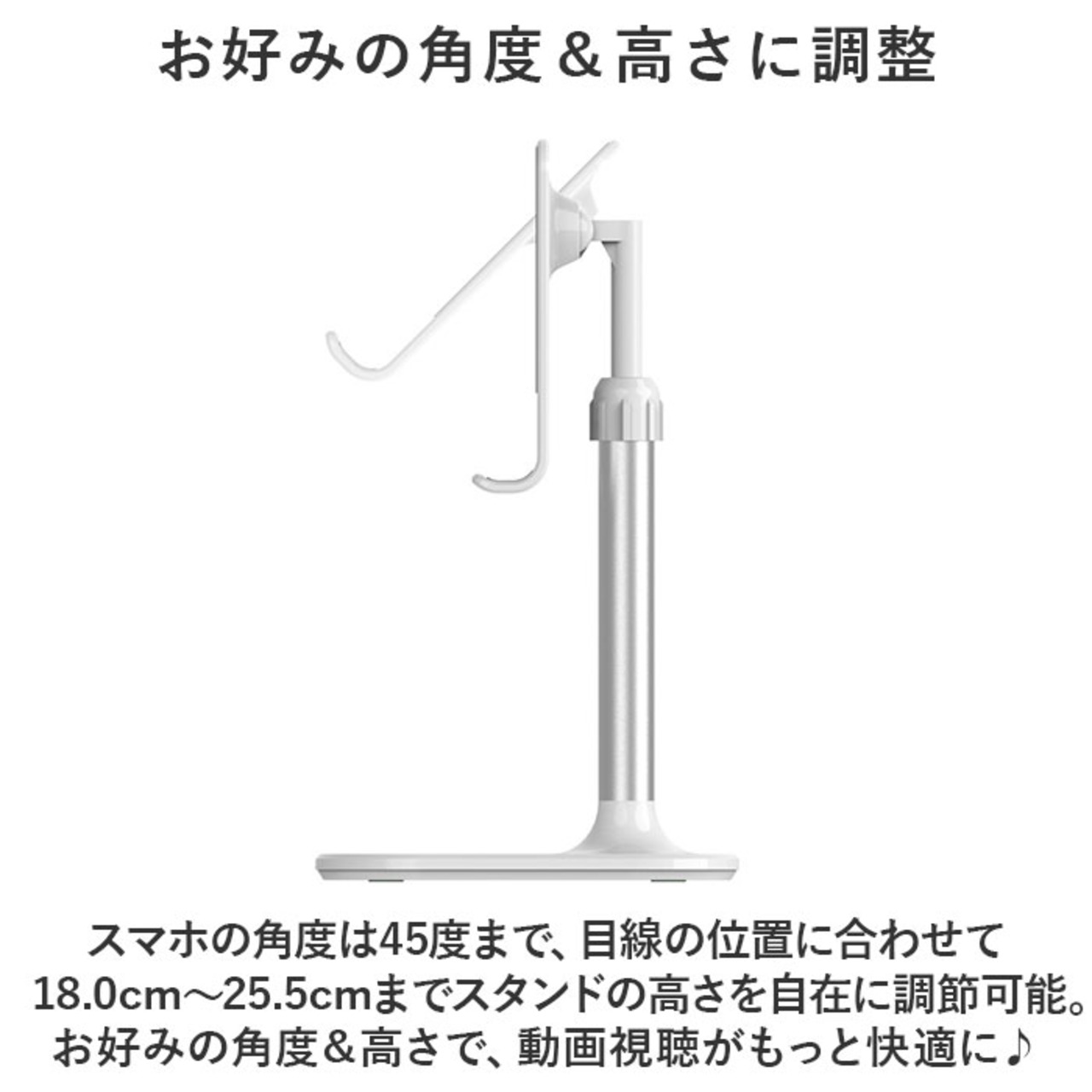 ・スマホの角度は45度まで、目線の位置に合わせて18.0cm~25.5cmまでスタンドの高さを自在に調節可能。お好みの角度&高さで、動画視聴がもっと快適に♪