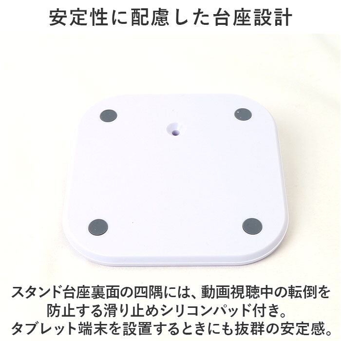 ・スタンド台座裏面の四隅には、動画視聴中の転倒を防止する滑り止めシリコンパッド付き。タブレット端末を設置するときにも抜群の安定感。