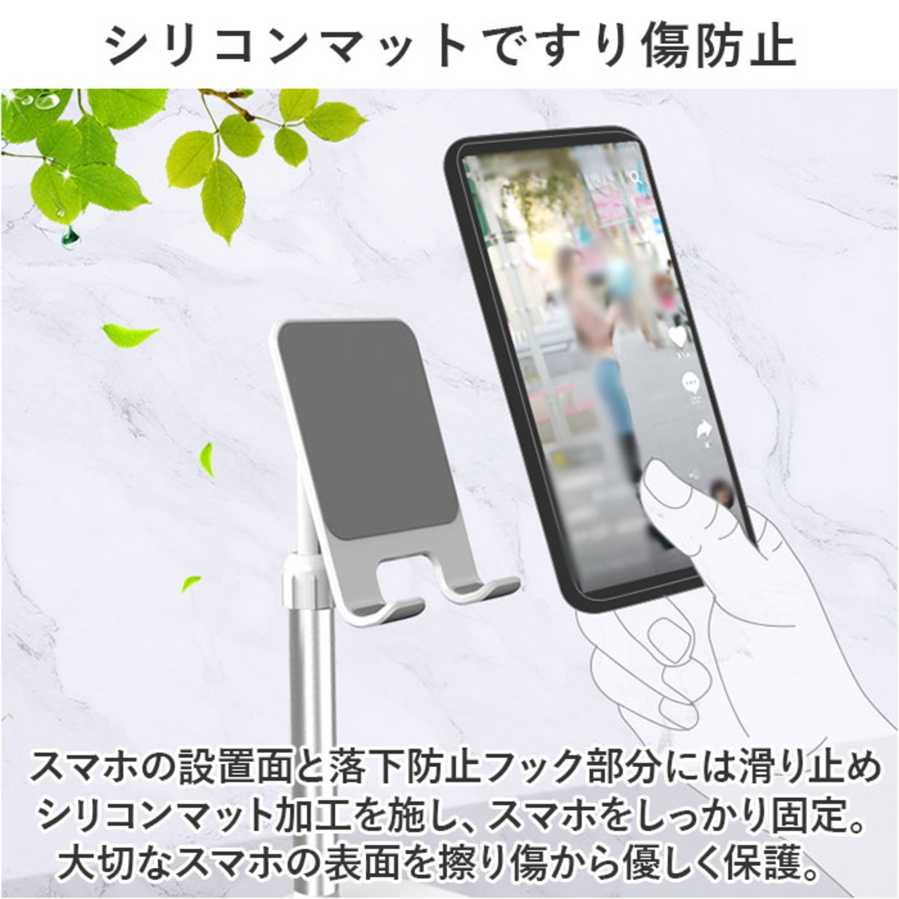 ・スマホの設置面と落下防止フック部分には滑り止めシリコンマット加工を施し、スマホをしっかり固定。大切なスマホの表面を擦り傷から優しく保護。