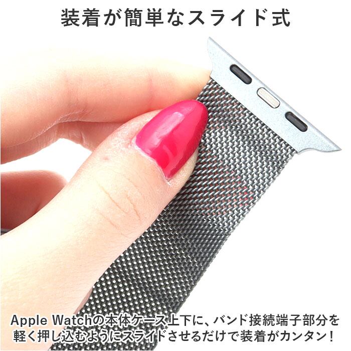 ・Apple Watchの本体ケース上下に、バンド接続端子部分を軽く押し込むようにスライドさせるだけで装着がカンタン!