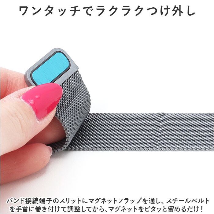 ・バンド接続端子のスリットにマグネットフラップを通し、スチールベルトを手首に巻き付けて調整してから、マグネットをピタッと留めるだけ!