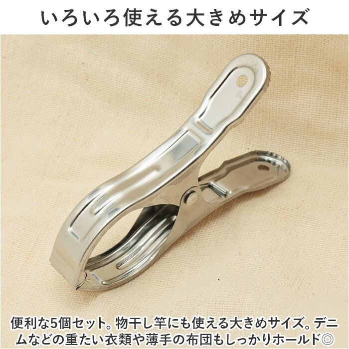 ・便利な5個セット。物干し竿にも使える大きめサイズ。デニムなどの重たい衣類や薄手の布団もしっかりホールド◎