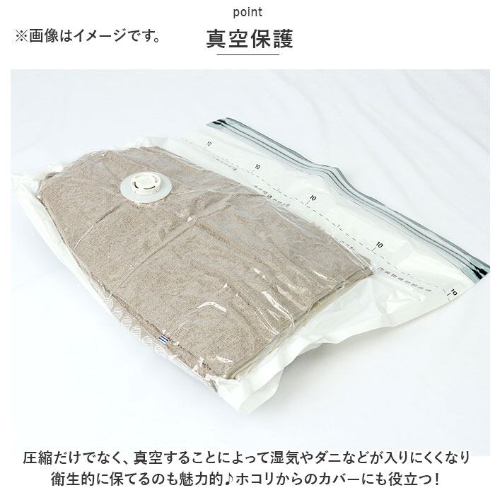 ・圧縮だけでなく、真空することによって湿気やダニなどが入りにくくなり衛生的に保てるのも魅力的♪ホコリからのカバーにも役立つ!