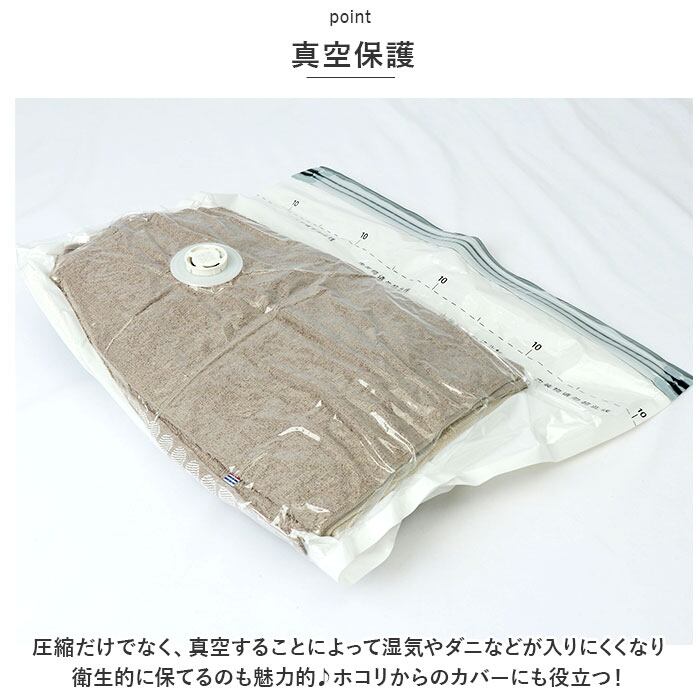 ・圧縮だけでなく、真空することによって湿気やダニなどが入りにくくなり衛生的に保てるのも魅力的♪ホコリからのカバーにも役立つ!
