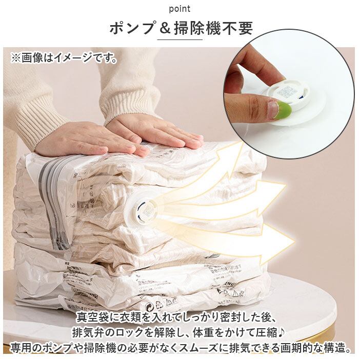 ・真空袋に衣類を入れてしっかり密封した後、排気弁のロックを解除し、体重をかけて圧縮♪専用のポンプや掃除機の必要がなくスムーズに排気できる画期的な構造。