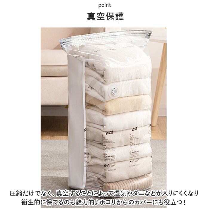・圧縮だけでなく、真空することによって湿気やダニなどが入りにくくなり衛生的に保てるのも魅力的♪ホコリからのカバーにも役立つ!