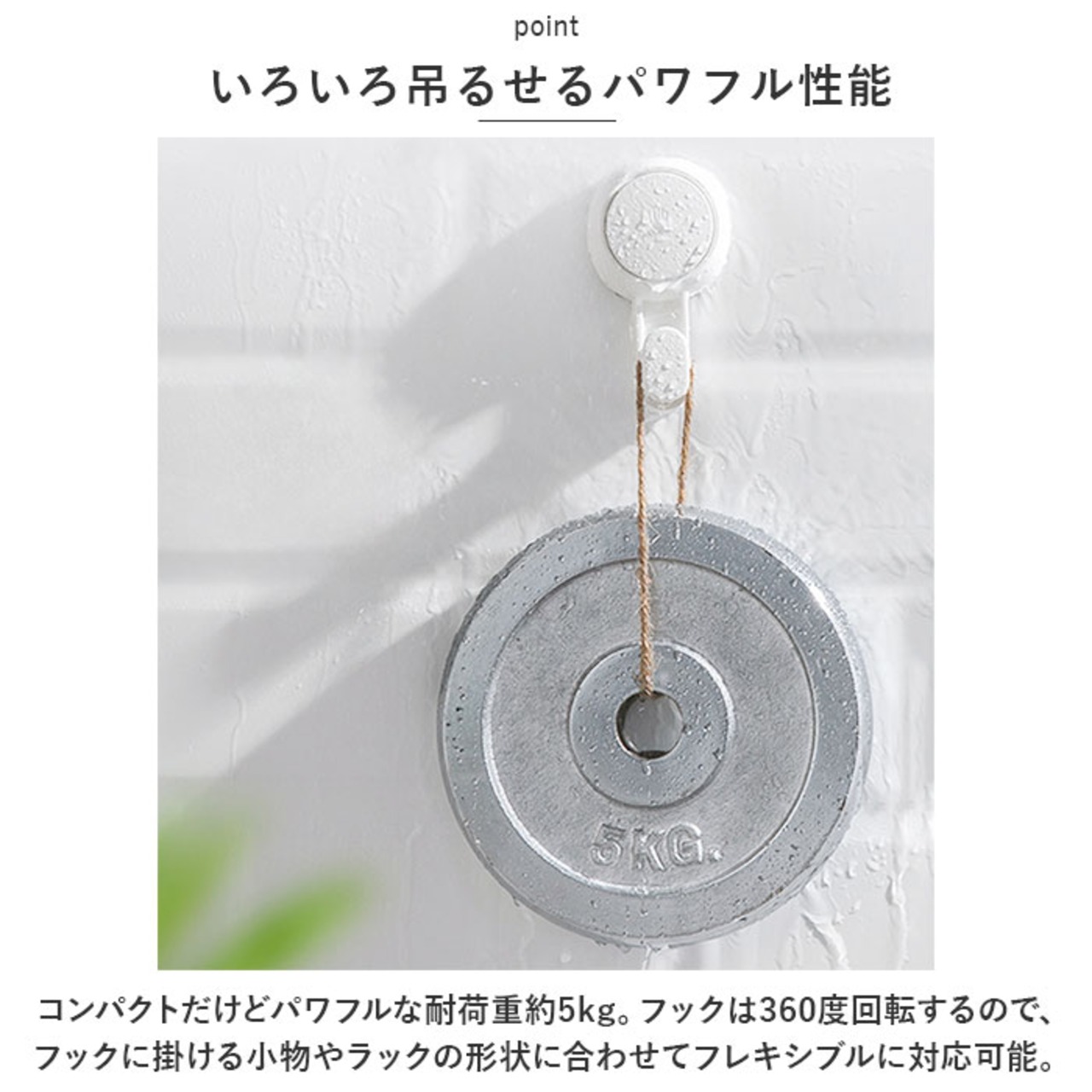 ・コンパクトだけどパワフルな耐荷重約5kg。フックは360度回転するので、フックに掛ける小物やラックの形状に合わせてフレキシブルに対応可能。