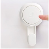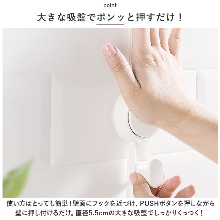 ・使い方はとっても簡単!壁面にフックを近づけ、PUSHボタンを押しながら壁に押し付けるだけ。直径5.5cmの大きな吸盤でしっかりくっつく!